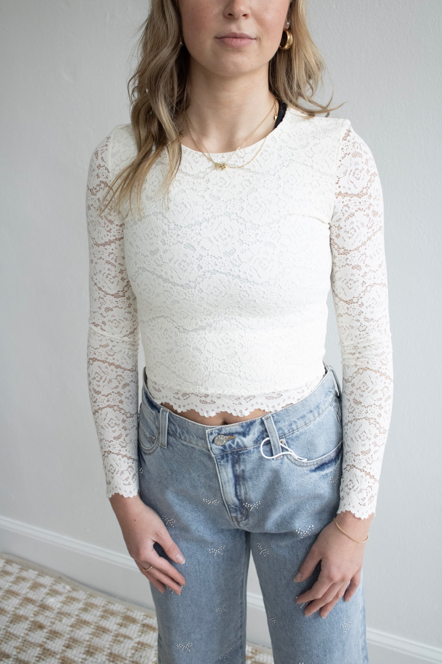 Crafted from stretch floral lace, this fitted long sleeve features scalloped edges and a crew neckline for a polished finish. The semi-sheer design feels equal parts romantic and chic.