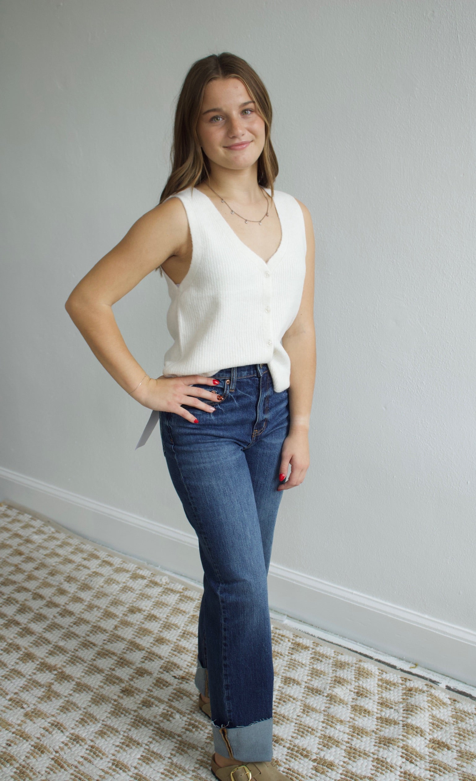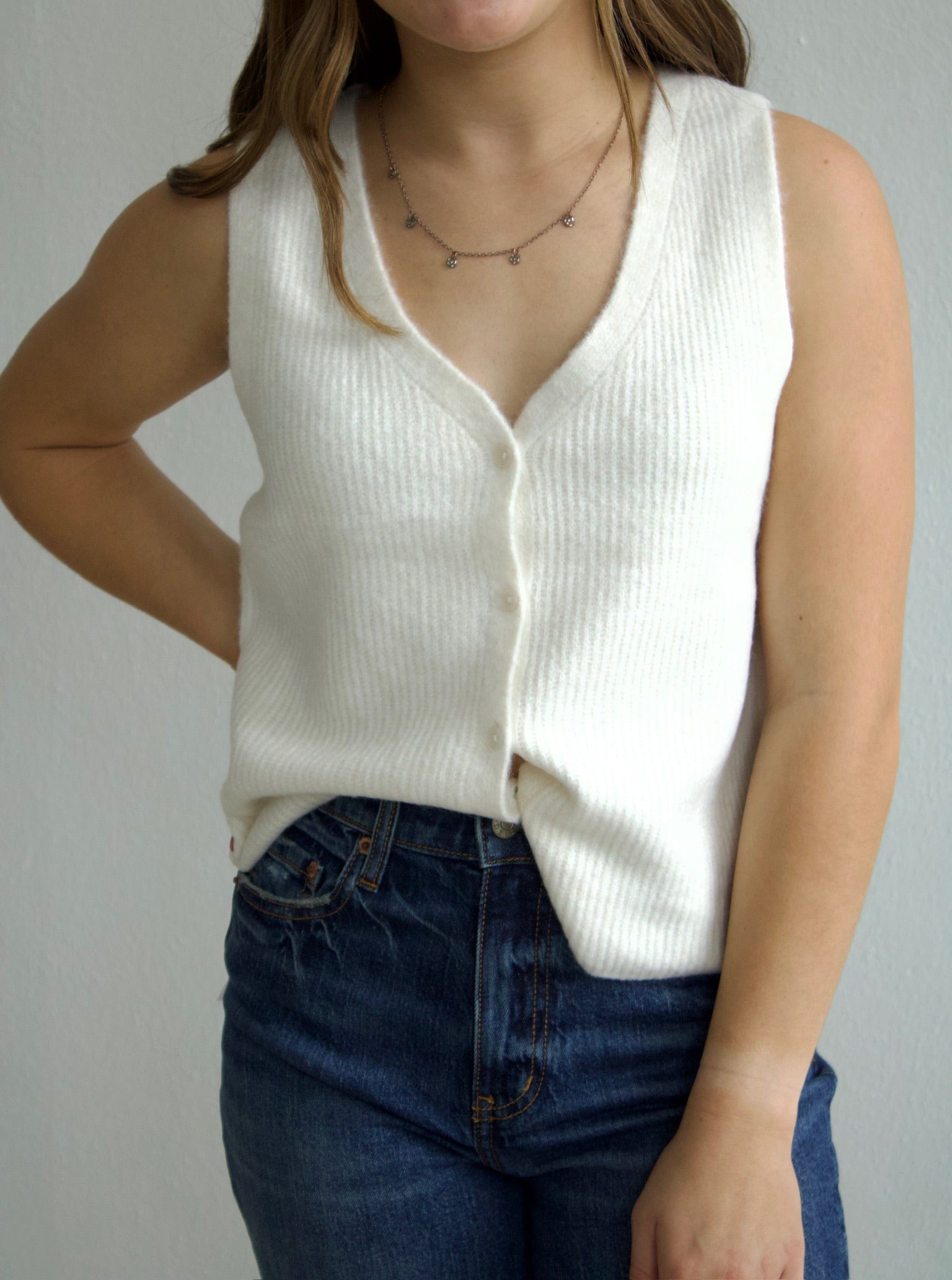 Designed in our soft Cozy Summer yarns, this sleeveless v-neck brings an airy weight and textured rib detailing. A standout piece that works solo in warm weather or layered as temps cool.
