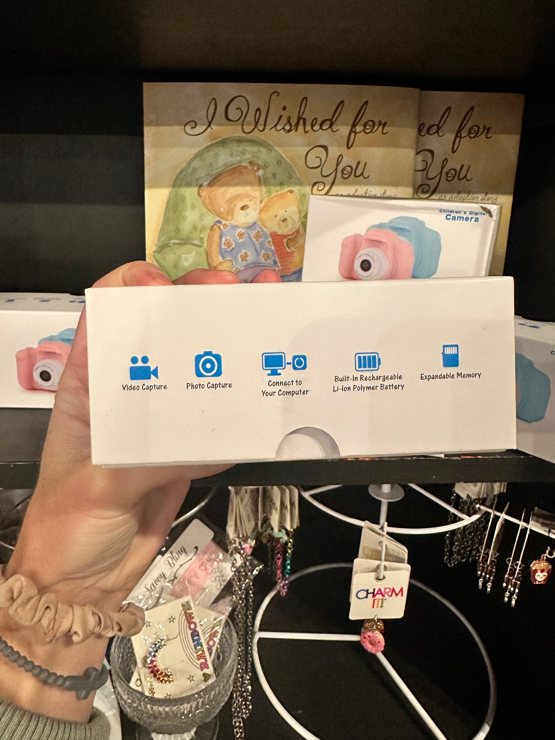 Includes: Camera, charging cord, 8g memory card and camera strap