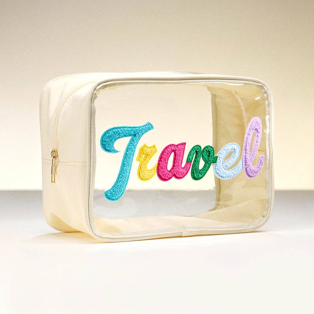 Fun and functional clear pouch featuring bold glitter lettering. Ideal for carrying poolside essentials, toiletries, or travel items. Water-resistant and stylish for on-the-go storage.