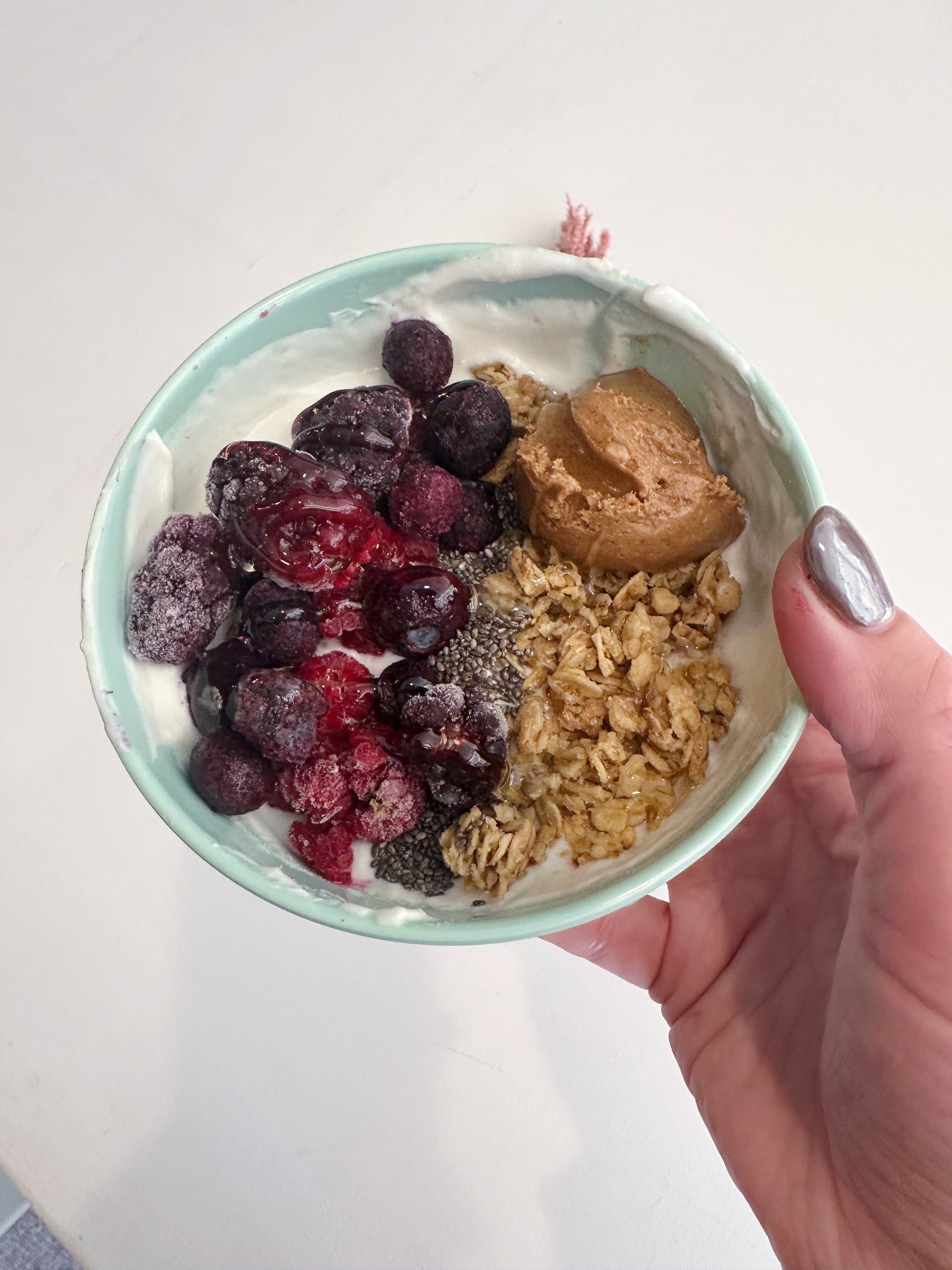 -toppings: granola, chia seeds, almond butter, honey, frozen blueberries, frozen raspberries, frozen blackberries (Nicole thinks frozen taste better)! You can always switch to fresh strawberries and bananas!