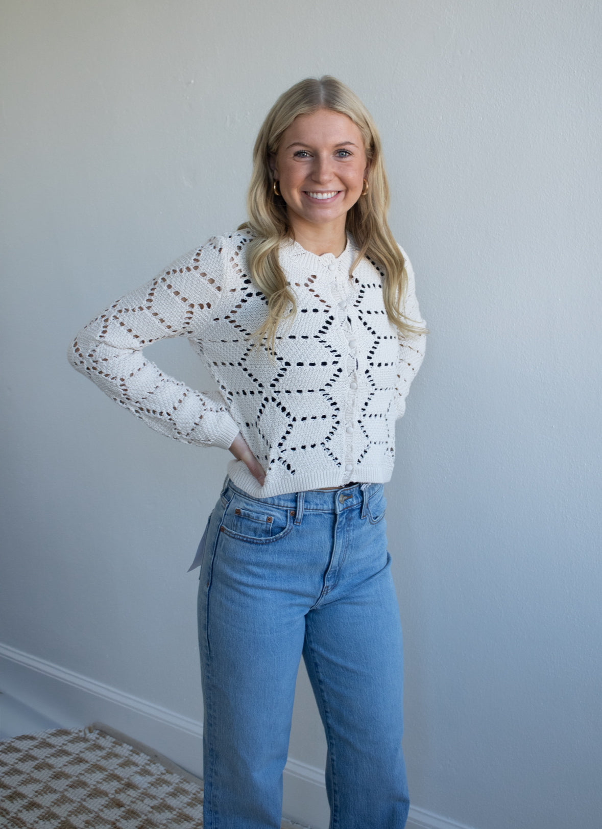 This airy crochet button-up is crafted from lightweight cotton with an engineered open-knit pattern that adds texture and feminine charm. Designed with a relaxed fit and soft finish, it’s perfect for easy layering all season.